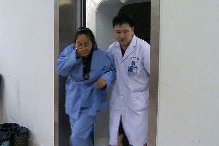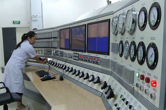 高压氧室医护人员正在按照启动应急处理预案,关闭供氧、供气阀门。