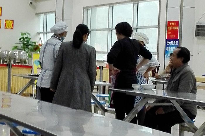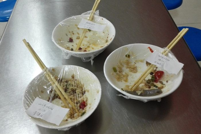 营养科在食堂员工不知情的情况下,请了三名保安到食堂就餐,模拟疑似中毒人员。12时30分,二楼餐厅职工就餐基本结束,三名正在就餐的保安突然喊腹痛、恶心、不舒服,食堂员工发现后,立即询问情况,并报告售卖组组长。售卖组长迅速查看、询问情况,并将疑中毒人员吃剩的饭菜封存放留样柜,同时另一名食堂员工继续安抚疑似中毒人员,并准备送门诊就医。其它员工随即停止供餐,对未售完的食品进行加盖封存,并留守现场。