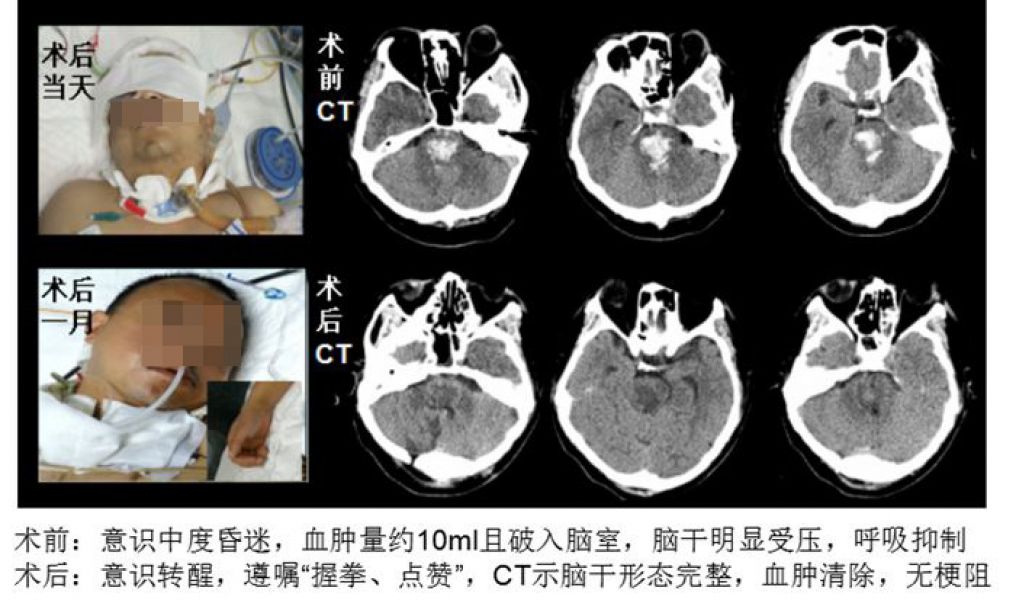 患者CT提示脑干出血,血肿体积约10ml,且梗阻性脑积水致颅内高压,生命体征不稳定。据医学文献报道,脑干出血量超过5ml,死亡率在90%以上,超过10ml,死亡率接近100%。然而,面对生命怎能轻言放弃?神经外科主任黄纯海博士指示要求全力抢救该患者。在神经外科二病区主任朱英杰有序指挥下,紧急术前准备于03:30将患者送至手术室,在全麻下由田志副主任医师主刀显微下行脑干血肿清除手术,并邀请耳鼻喉科医师行气管切开术,术后转送入ICU重症监护治疗。以神经外科黄纯海、朱英杰、周桂林和ICU麻怀志主任为首的神经重症救治团队通力协作,随时关注患者病情变化,多次召集院内专家以及邀请省内专家会诊,商讨最佳治疗方案。经过医护人员的积极治疗与精心照料,患者于15号顺利拔除侧脑室引流管及手术切口拆线,16号顺利脱机,恢复自主呼吸,20号患者逐渐恢复意识,可遵嘱活动肢体。目前患者正在进行功能康复治疗。
