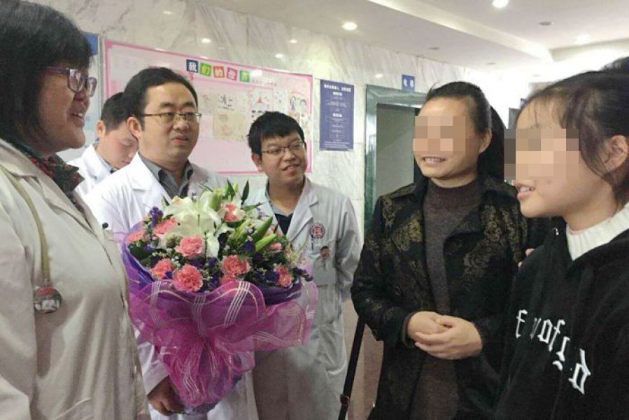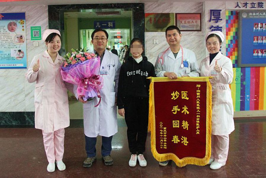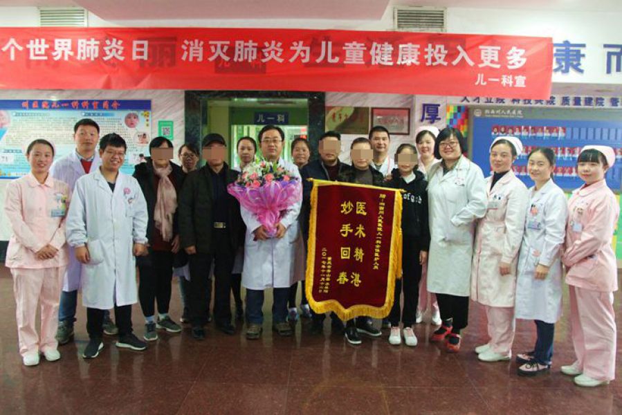 11月20日,一个平凡的日子,但对来自重庆市秀山县的12岁的患儿李某某一家来说却不一样,那是他们永生难忘的一天。患儿李某某在与家人经历“生离死别”,住院22天之后,终于痊愈出院。家属将一幅绣着“医术精湛、妙手回春”的大红锦旗及一束艳丽的鲜花送到医护人员手中,感谢儿一科全体医护人员从死亡线上将她的女儿抢救回来。