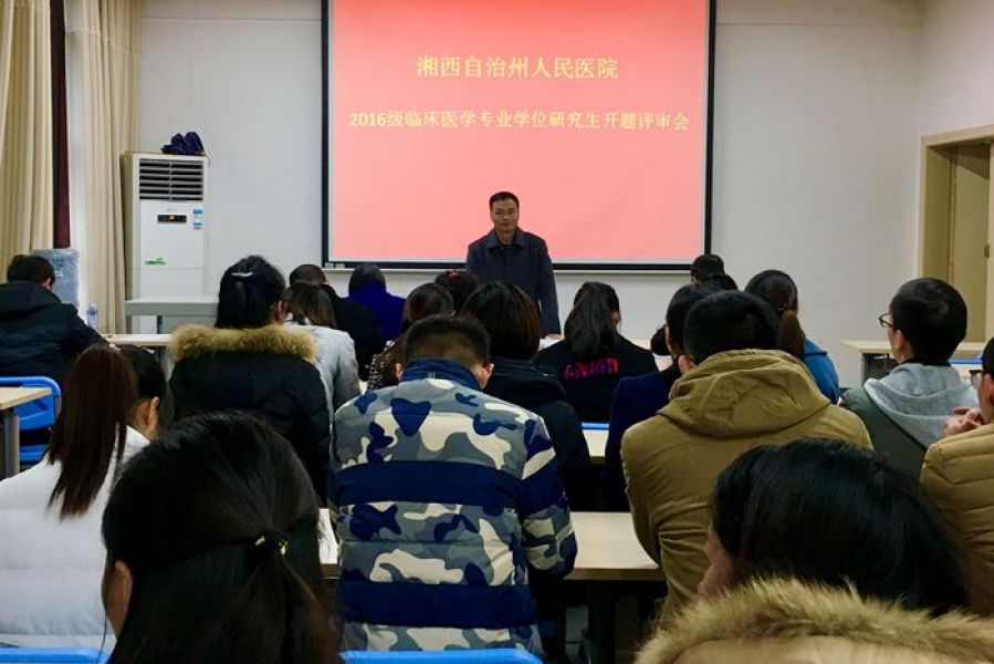 12月13日下午,吉首大学2016级临床医学专业学位硕士研究生开题报告评审会在全科楼308教室召开。报告会邀请吉首大学医学院副院长秧茂盛教授、大外科主任黄纯海、大儿科主任梅帅虎、大妇产科主任林彤、呼吸内科副主任吴秀明等共同担任评审组专家。