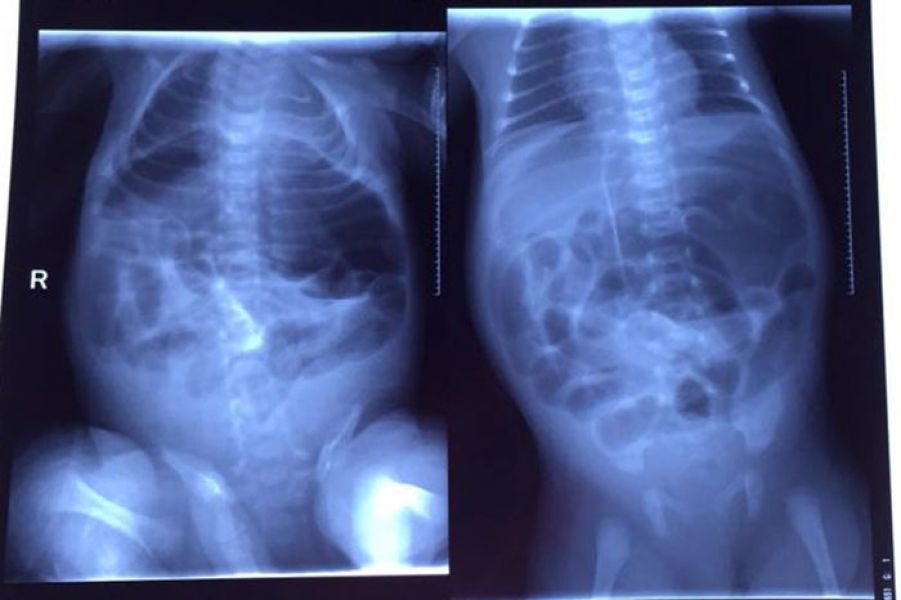 产后42小时,小女因身体孱弱即入住新生儿重症监护室,出生时体重仅仅2.2公斤。初步诊断为“早产儿;低体重儿;新生儿败血症”,当天腹部检查未见异常。第二天,患儿进食少许奶水后出现腹胀,呕吐。急诊行B超检查提示“腹腔积液,肠管扩张”;腹部X线片检查提示“腹部大小肠管扩张积气,双侧膈下游离气体考虑气腹”。急诊请普外五科会诊。