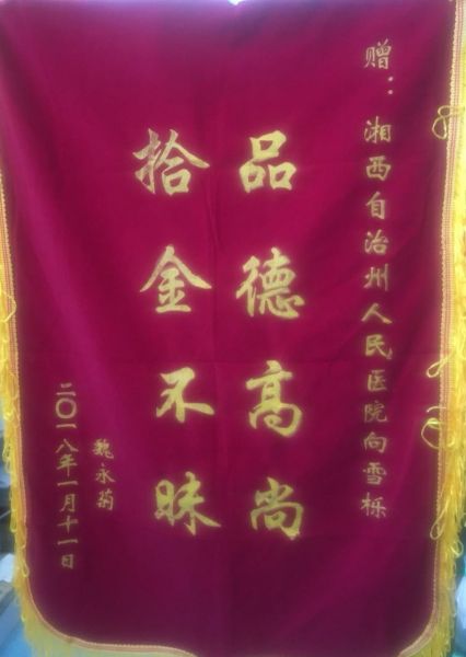 2018年1月11日下午1点25分,魏某某陪同亲戚来我院就医,缴费时不慎将钱包遗失在门诊3楼收费窗口。当时排队人少,收费员向雪栎发现后,立刻向最近时间内来挂号、缴费的患者一一打电话询问,除2名病患因通信问题无法确认外,其他患者均表示自己没有遗失物品。下班后,向雪栎将拾得的钱包上交。下午5点30分左右,失主魏某某来我院寻找,拿回了自己遗失的现金及其他物品。第二天,魏某某送来一面锦旗,表示谢意。