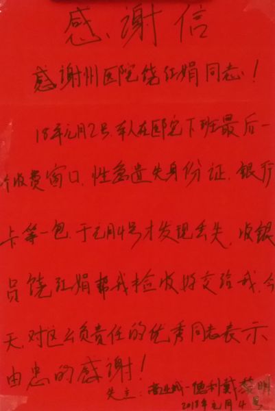 2018年1月2日下午4点30分,患者戴某某来我院就医缴费时,因一时心急,不慎将随身携带的背包遗失在门诊收费大厅3号窗口并被收费员饶红娟拾得。因当时排队结算人数众多,饶红娟只好将相关情况及背包汇报、上交给班组领导。戴某某1月4日才意识到遗失背包并来我院需找,最终背包及包内现金、卡证等物品原封不动的交还给失主。次日,戴某某专程送来感谢信表示感谢。