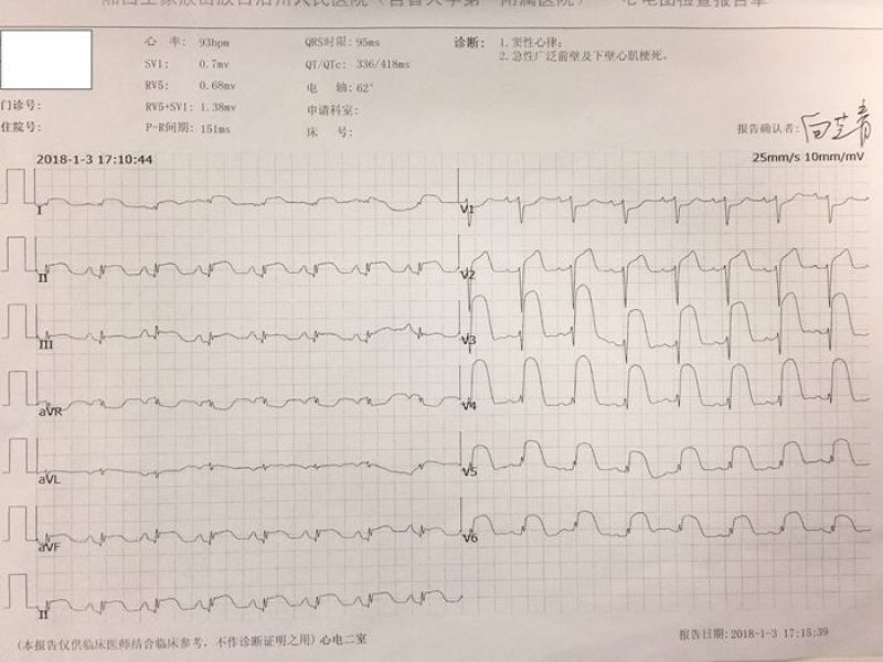 1月3日,一名47岁男性患者因上腹痛3天入住心内二科。体格检查除血压偏低(95/62mmHg)外,其它未见明显异常。心电图显示广泛性ST段抬高(见附图),心肌酶升高(CK1365u/L,CK-MB83.4u/L),肌钙蛋白Ⅰ9.549ng/mL。冠状动脉造影未见明显异常,心室造影显示前侧壁及心尖部运动减弱,EF值37%。心脏彩超左室广泛前壁及心尖部运动减弱,EF值40%。