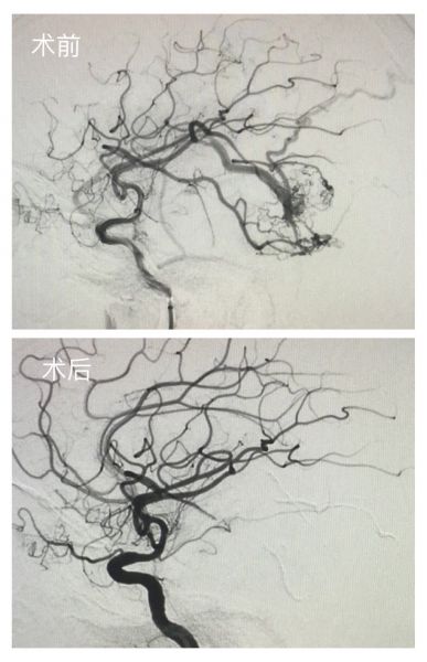 向医院反映了患者的特殊情况后,院方高度重视,组建了医疗小组,由黄纯海副院长总负责,医务科科长贾浩组织协调。在介入科、麻醉科的积极配合下,朱英杰和田志两位医师采取血管内介入治疗的方法对患者颅内复杂的畸形血管进行了栓塞治疗。高难度的手术进行的非常顺利,术后造影检查显示患者颅内畸形血管完全消失,“定时炸弹”彻底解除。术后,患者恢复良好,没有任何的后遗症出现。吴某某对神经外科二病区的医生竖起了大拇指:“你们真厉害,不开刀就治好了我脑袋里的病,真是太神奇了!”