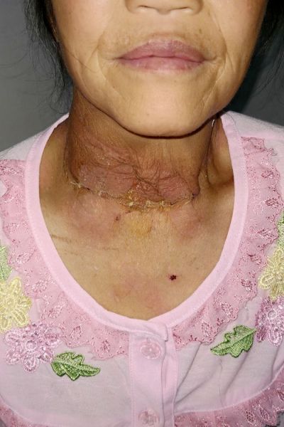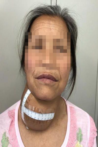 2018年4月,普三科(乳腺甲状腺外科)收住了一位特殊的病人,患者,女,61岁,湖南省永顺县人。发现颈前区巨大包块40余年,既往因经济原因,一直没有经济能力医治,至使肿块逐渐增大压迫气管,严重时影响了日常生活。如今精准扶贫建档立卡户先住院后结帐给患者带来了福音,患者开始了求医之路,但是都被多家医院拒之门外,告知肿块巨大,手术风险大,手术难以实施,一次偶然的机会,患者来到了州医院普三科,让患者看到了希望。