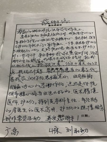“我作为患者的妻子,我代表我全家表示最真心,出自肺腑出自最内心的感谢你们。”5月20号,一切如常的州人民医院心内二科收到一位患者妻子的感谢信。