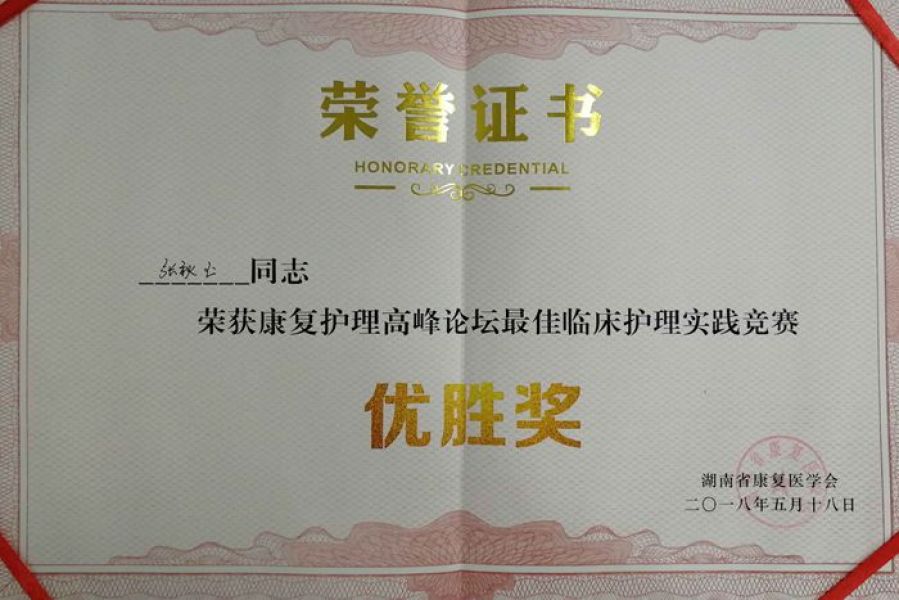 5月18日上午,第三届潇湘康复护理高峰论坛暨中国老年保健协会康复护理专业委员会“我们用爱让康复护理前行”康复专科主题个案竞赛活动在湖南省人民医院举行。康复护理优秀个案征集共计收到102份展示成果,由康复科护士长全庭婷指导的专科护士张秋玉的康复个案在全国预赛中脱颖而出。