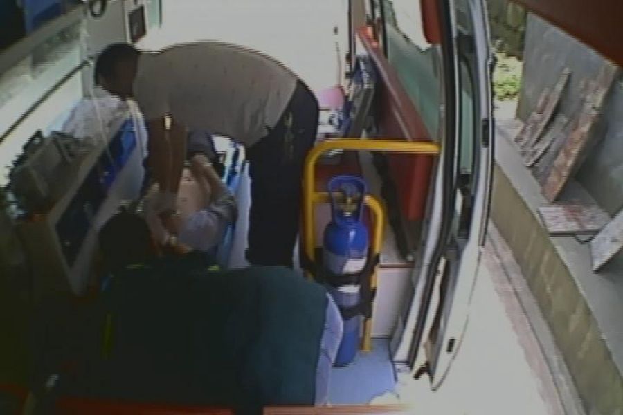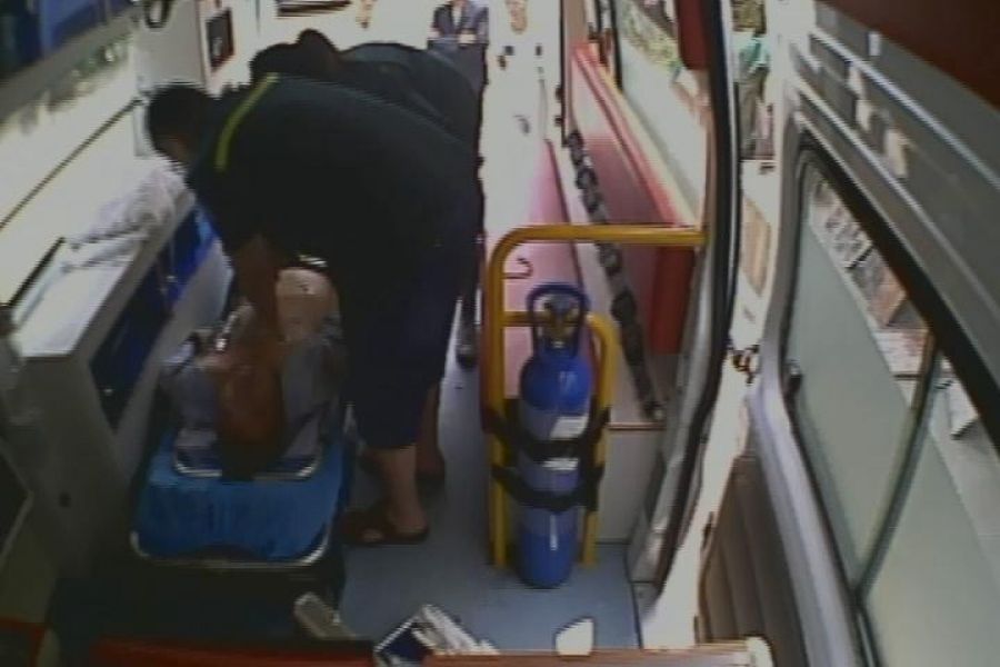 急救人员接到患者后,立即对患者进行评估,发现患者呼之不应,面色发绀,大动脉搏动消失,胸廓无起伏,判断为呼吸心跳骤停。医生指示立即实施抢救,将患者仰卧于硬质担架上,进行心肺复苏、电除颤、气管插管、上呼吸机。经过医生护士及司机有序地配合,积极抢救近30分钟。患者恢复自主心律,意识尚未恢复,继续予机械通气,心电监护,液体维持,救护车一路飞驰,以最快的速度将患者转往我院急诊科进一步救治。
