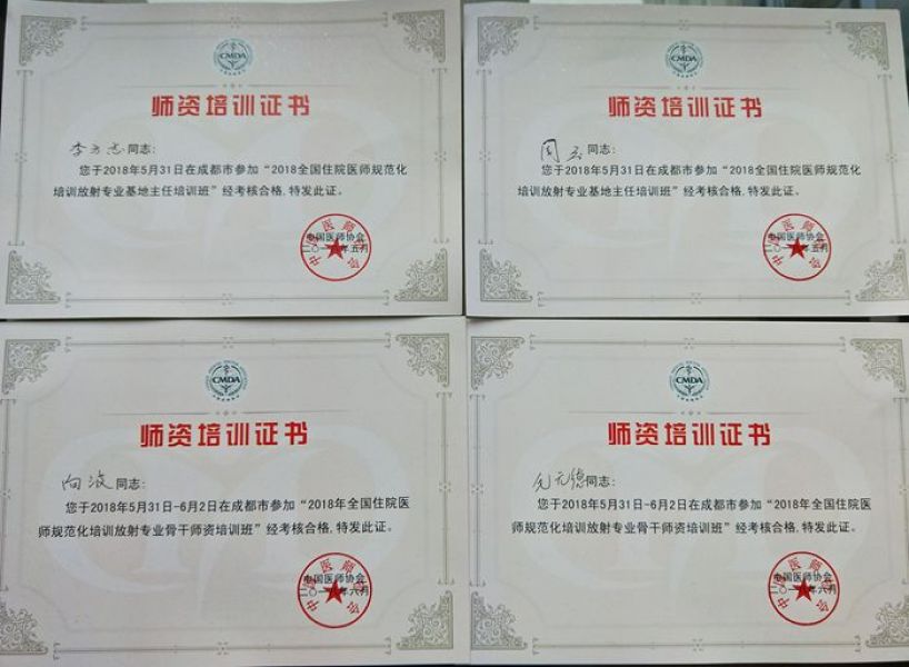 我院影像科室参会人员圆满完成参会任务,经考核合格CT室李方志主任、放射科周云主任被授予住院医师规培基地主任证书,放射科毛元德和向波医生被授予住院医师规培放射骨干师资证书。他们学到了许多新颖带教方法和思路,将为我院放射科住培专业基地的进一步发展铸辉添彩。