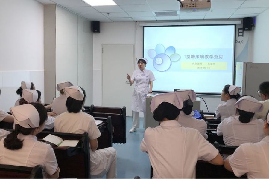 6月14日,内分泌科在责任组长吴春艳的组织下,护士长张倩、全科室护理人员和护理实习生共同参加本次护理查房。所查对象为1型糖尿病患者,因口干、多饮、多尿入院。本次查房打破以往固有模式,在主持人介绍病人基本情况后,参与人员按层级分成两组,以高年资责任护士带低年资护士,带教老师带护生的模式,共同讨论患者当下最主要的护理问题。她们或来到床旁询问患者的病史、查看患者体征,或查阅患者辅助检查结果,或翻阅疾病相关资料,不放过蛛丝马迹,找出每一个能证明自己所提护理问题的依据,将书本上的每一个知识点联系到患者当下的护理问题中,找到适合患者的护理措施,解决患者的护理问题。整个过程中护生们提问的积极、老师们解答的全面,各小组讨论的热烈,护士长总结的精辟,形式新颖,内容丰富,将理论联系到实际,寓教于乐。