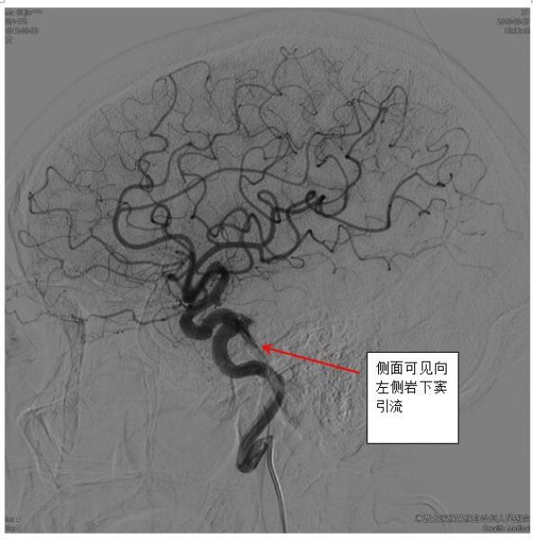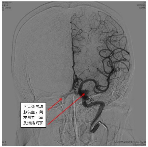 一旦怀疑DAVFs,神经内科一病区医生迅速和患者及家属沟通,及时完成脑血管造影,第一时间确诊患者为海绵窦区DAVFs(供血动脉为左侧颈内动脉海绵窦段,向左侧岩下窦及通过海绵间窦向对侧岩下窦引流)。