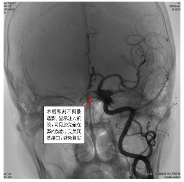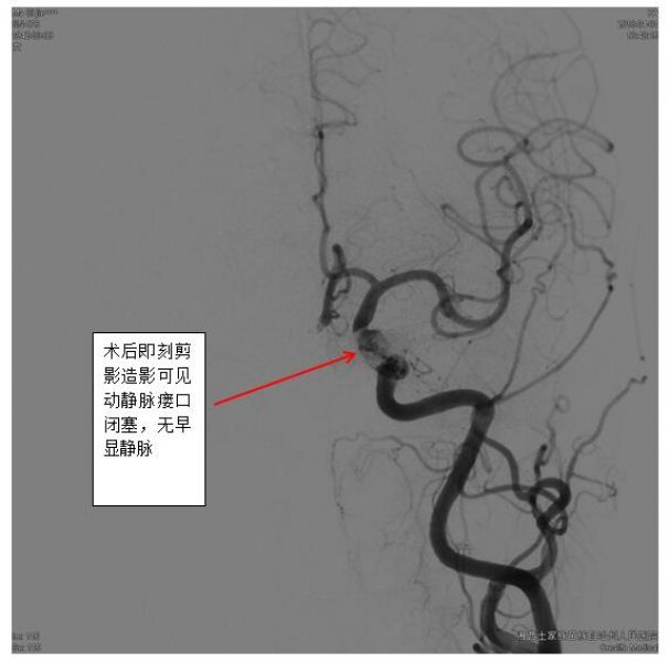 最终,经过充分准备,凭借精湛的技术,手术组田勇副主任医师、梁承财主治医师在刘凡教授指导下,在护理人员及麻醉师同力合作下,顺利通过颈内静脉-岩下窦入路,采用弹簧圈辅助加注入onxy胶的方式完全闭塞瘘口,患者术后没有神经功能缺损。