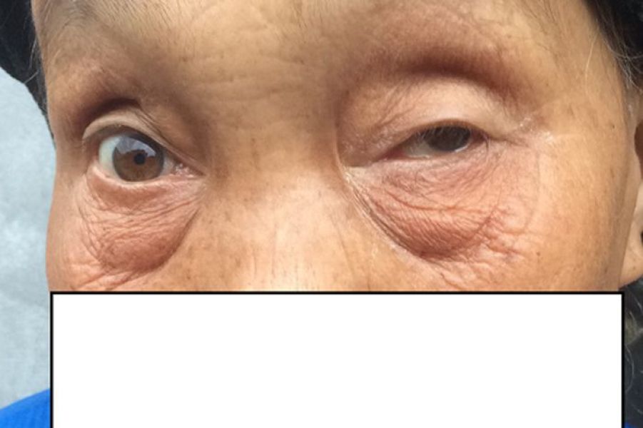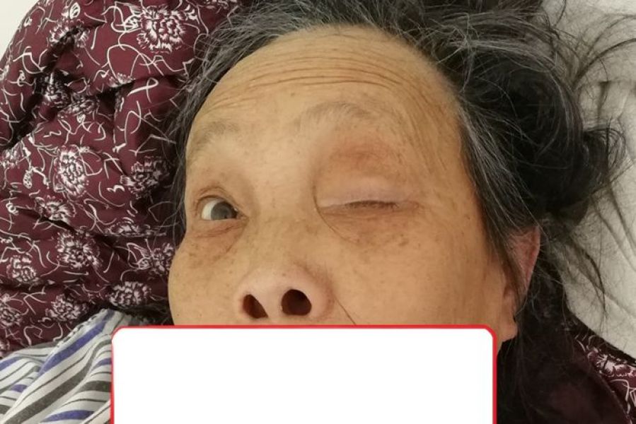 术后一月余,左侧动眼神经麻痹明显好转,头痛完全消失,眼睑可以部分睁开