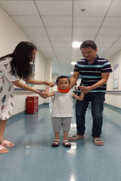 术后患儿的恢复并非一帆风顺。术后第二天,汤雅护士长和管床医师观察到患儿呼吸急促,心跳进一步加快,一度达到200次/分。急诊进行床旁心电图及床旁X片检查,提示存在胸腔积血增多,需要行双侧床旁行胸腔穿刺引流。心胸外科杨智杰医师凭着多年的小儿胸腔穿刺经验,成功实施穿刺引流,引流出积血约250毫升。小儿内科重症监护室的何万军副主任急会诊,对术后患儿的水电解质平衡的维持以及必要时行呼吸机支持进行相关指导。术后加强止血治疗,经过一周的引流及营养支持,水电解质平衡的维持等治疗,患儿胸腔腹腔内的积血逐步减少,术后第5天开始拔除肝脏止血纱条,术后第12天开始拔除胸腔引流管,术后16天拔除腹腔引流管,患者逐步康复。术后第6天开始进流质饮食,术后第10天恢复软食。第18天开始进行定制的颈托外固定。术后第22天第一次戴着颈托站起来,患儿的恢复逐步走向成功!