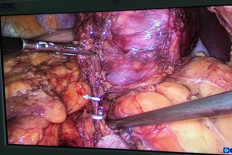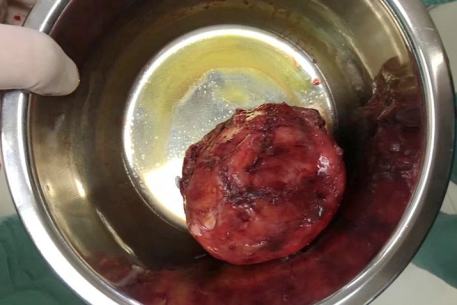 在科主任宋新的支持下,肝胆外科一病区的手术团队反复推敲、研究该手术的各技术环节,完善术前准备,做好多种手术预案的准备,于7月5日在全麻下实施腹腔镜下左侧腹膜后巨大肿瘤切除术,手术过程顺利,完整切除肿瘤,手术共历时2小时15分钟,术中患者生命体征平稳,术中失血少于20ml,术中肿瘤快速病理检查报:符合良性病变。关闭好后腹膜,未放置任何引流,术后安返病房。
