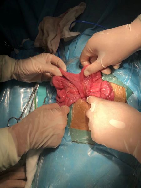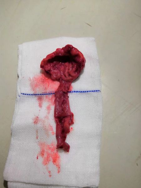 患儿男性,3岁,因反复无诱因腹痛、腹胀2年余入院。患儿既往曾因多次腹痛在省级医院就诊,诊断“腹腔肿块:肠重复畸形?”“腹腔肠系膜淋巴结肿大”,医生讲明手术风险后患儿家属未接受手术治疗。患儿腹痛迁延不愈。得知我院小儿普外专科已经成立,遂来我院就诊,收住普外五科。入院后经腹部彩超检查提示“右侧中下腹腔内含气包块”,行腹部CT检查,提示“腹部囊性肿块,来源于肠道可能”。综合患儿两年来的就诊情况以及多次检查情况,仔细查看CT片,诊断为“肠重复畸形”,于2018年08月23日行腹腔镜探查手术。术中发现患儿回肠中部有重复的管状肠管分支,异常肠管经系膜侧面与正常肠管相连,重复肠管远端以膨大的囊肿样肠管粘连于腹膜后,仔细分离并完整切除病变肠管及分支血管,修补正常肠管裂口。手术顺利,术后病理证实为重复肠管,术后观察治疗9天拆线,痊愈出院。