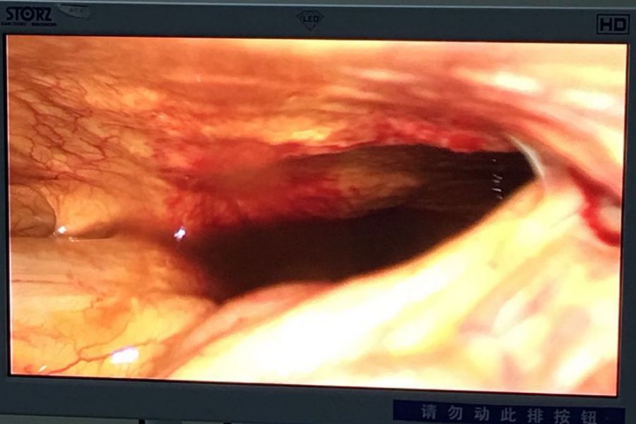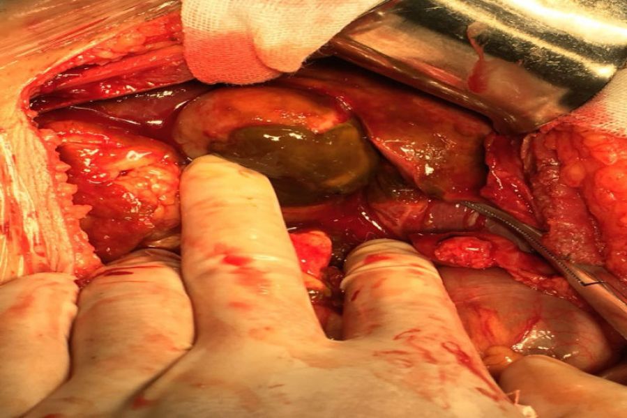 患者80岁,患者10余天来因“急性胆囊炎”在外地医院保守治疗,近3天开始出现低热,为求进一步治疗特来我院。患者6个月前曾在我院行髋关节置换术。入院查B超及CT均示胆囊形态增大,肝周及胆囊窝区大片积液暗区,临床诊断胆囊穿孔,有急诊手术指征。但患者高龄,既往有血栓病史,手术风险高,与患者家属沟通后,患者家属同意行手术治疗。术中腹腔镜探查,见腹腔大量脓性胆汁,吸出约2000ml胆汁,肠管网膜水肿,胆囊体部局部坏疽穿孔。腔镜下虽可切除胆囊,但腹腔清洗不彻底,脓液残留,术后易形成包裹性积液,并发感染可能,于是中转开腹行胆囊切除+肠粘连松解+腹腔灌洗术。手术过程顺利,术后恢复正常,患者已出院。