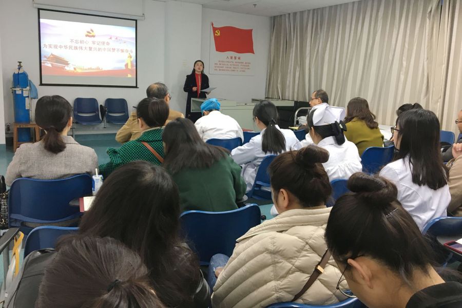 活动两个议程,首先由第二党支部支委黄娟上了学习《不忘初心,牢记使命》的党课,她深刻解读了中国共产党人的初心、为什么要不忘初心、为何才能不忘初心等方面重要内容。她号召每个党员要挺纪在前不逾矩、要无私奉献有作为、要品行端正作表率、立足岗位不忘为人民服务、为患者服务的初心。