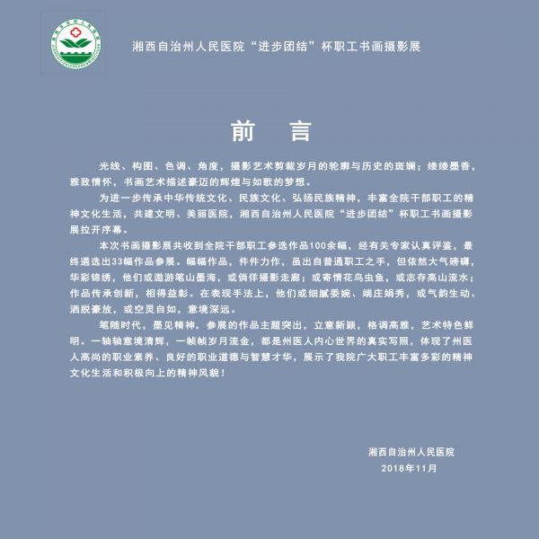 11月12日,州人民医院“进步团结”杯书画摄影比赛影展拉开序幕。