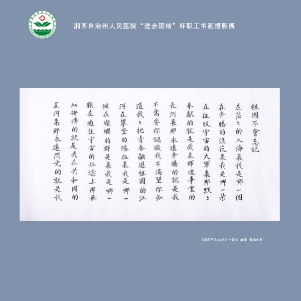 来自医院退休职工郑振明的作品《吉首西郊新貌》获绘画类一等奖,心功能检查科何轩的作品《花开富贵》获绘画类二等奖,骨一科龙新页的作品《祖国不会忘记》获绘画类三等奖。肾内科麻慧的作品《祖国不会忘记》获书法类一等奖,党办龙建明的作品《望洞庭湖赠张承相》、医保办杨洁的作品《海纳百川》、药剂科郑云飞的作品《单丝不成线独木不成林》获书法类二等奖,扶贫办向佑的作品《苏东坡诗集》、肾内科葛叶的作品《赞州医院诗一首》、总务科郑振明的作品《厚德载物》获书法类三等奖。设备科陈洁的作品《云上通途》和呼吸内科支纤镜室蒋向群的作品《日暮乡关》获摄影类一等奖,保卫科向咏梅的作品《夏荷》等五幅作品获摄影类二等奖,手术室曹鹰的作品《拥抱大海》等八幅作品获摄影类三等奖,手术室郑蓉的作品《山水之间》等五幅作品获摄影类优胜奖。本次影展共遴选出33幅作品参展。
