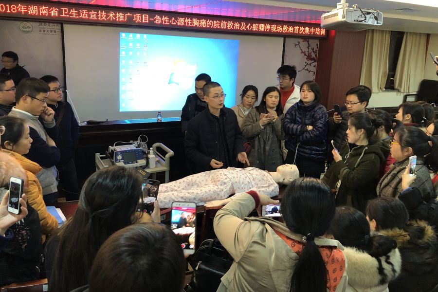 所有参训人员进行了胸痛中心建设的意义及建设流程、常见心律失常的用药、STEMI溶栓治疗、如何做好转运PCI、急性胸痛的鉴别诊断、心脏骤停的院外救治、心肺复苏及除颤操作、急性心梗心电图、常见心律失常、心血管危急重症的应急处理和护理等内容的培训。