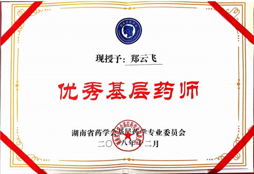 郑云飞通过层层选拔,被评为首届湖南省药学会“优秀基层药师”称号。