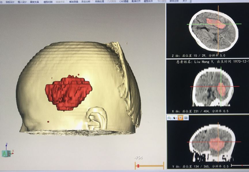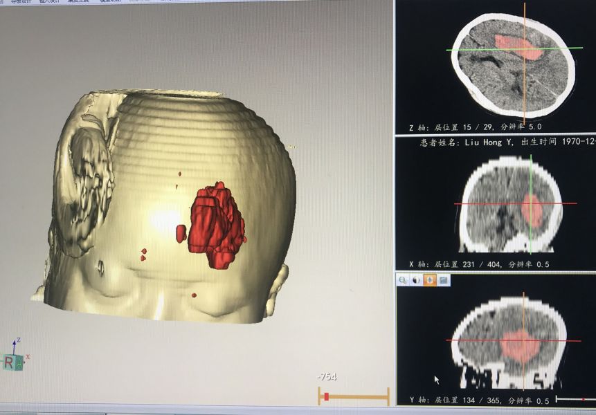 神经外科王钊医师利用3D软件对患者的CT进行了脑出血模型重建,并进行模拟穿刺,通过在电脑上反复模拟演练,选择避开重要脑组织结构和血管、对病患脑组织损伤最小的通道。