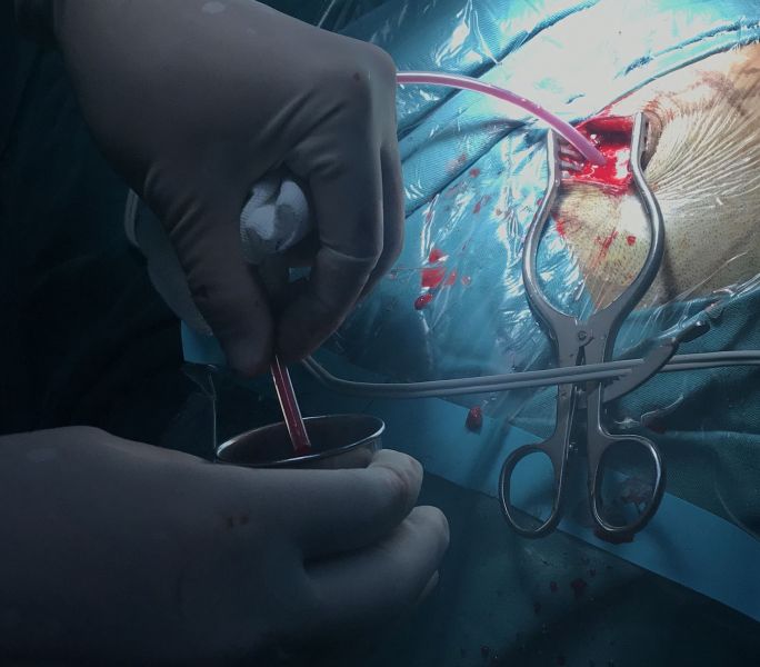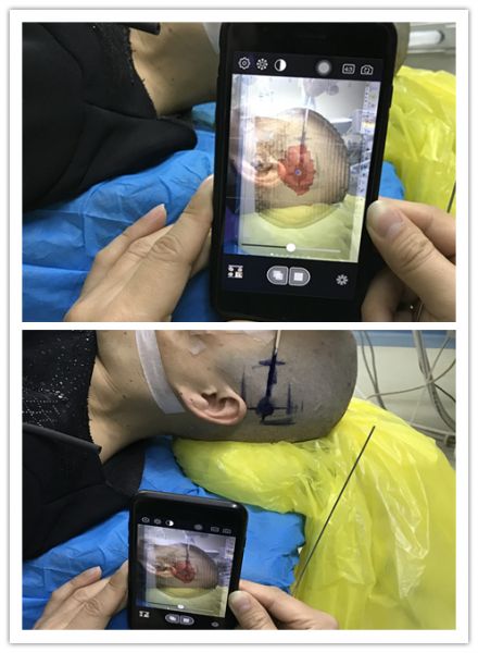 术中田志副主任医师和熊柏然医师利用血肿模型和模拟通道通过手机APP软件在患者头部体表进行投映精准定位,软通道穿刺一次到位,可见到暗红色不凝血性液体自行流出。