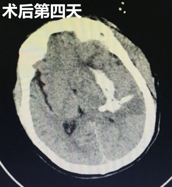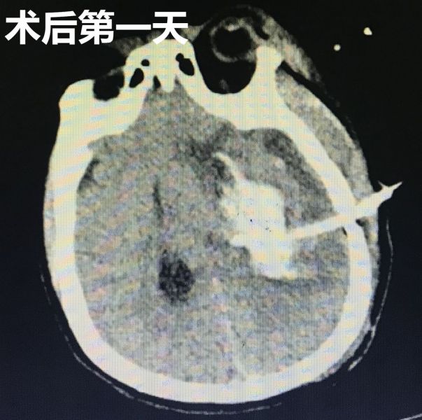 术后复查CT显示穿刺引流管位置良好。通过三天的引流血肿,再次复查CT显示颅内血肿已大部分清除,患者术前受压的脑组织也基本回位,病人的意识状态也比术前明显好转。目前患者病情稳定,正积极康复治疗中。