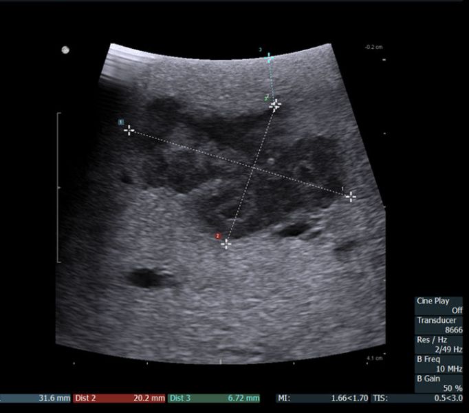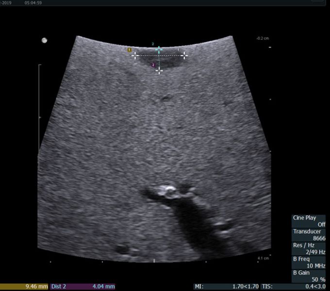 术中超声示肝VIII段肿块大小及距肝表面距离