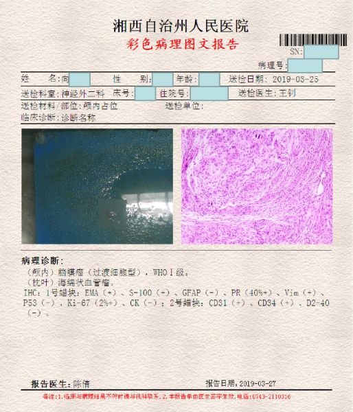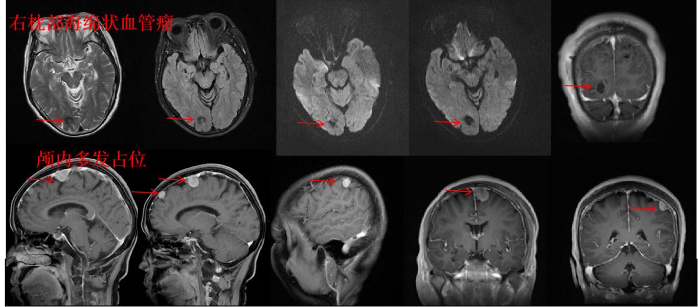 患者向某某,65岁,半年来反复头痛头晕并伴有视力下降,在当地医院以颈椎病诊治,效果不佳。近日,他慕名来到州人民医院就诊,神经外科二病区副主任田志接诊了该患者。通过颅脑磁共振平扫+增强检查,发现该患者是一例罕见的颅内海绵状血管瘤出血合并多发占位的病例。神经外科二病区主任朱英杰立即组织阅片讨论,认为患者主诉有视力下降改变,磁共振提示右侧枕叶呈典型“爆米花”样影像学表现,符合海绵状血管瘤反复出血的征象。另外,患者左侧大脑半球存在三处占位性病灶,增强提示考虑为脑膜瘤可能性大。