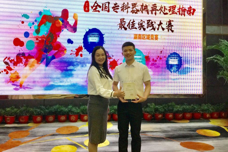 16支代表队选手运用PPT文稿、动态视频、现场示范等各种形式,综合本院和自身丰富的实践经验,分享器械再处理过程中的要点、难点和标准点。每名选手都使出浑身解数,通过精彩的语言,图文并茂的方式,富有感染力的表情动作将内容展示的淋漓尽致。最终经过激烈角逐,消毒供应中心唐宏舟表现优秀,他演讲的《眼科手术器械再处理的清洗消毒操作实践》荣获三等奖。