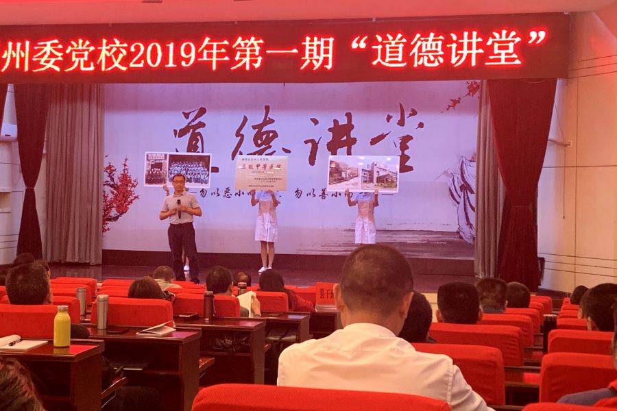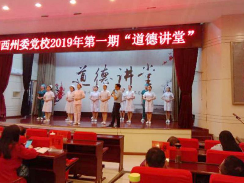 4月28下午,在州委党校2019年第一期道德讲堂“讲一个故事”环节,科干班学员、我院党委办主任龙建明同志作登台讲述了《伟大精神需要共同铭记》,我院15名护士上台助演,引起强烈反响。