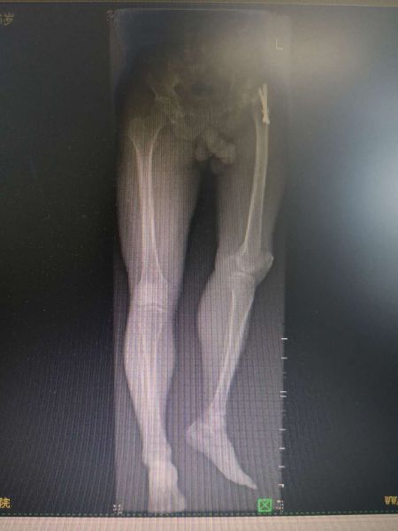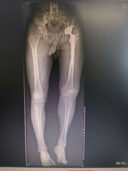 患者慕名找到湘西州人民医院骨一科主任赵峻主任医师,希望通过赵峻主任医师的治疗,能够自由行走,不再受疼痛的困扰。赵峻主任医师带领其团队,对患者进行仔细的体格检查,并仔细阅读了患者的相关影像学资料,发现患者左髋关节活动度已完全尚失,左下肢明显外旋畸形,且左下肢较对侧短了近6cm。经赵峻主任医师及其团队讨论后,制定详细的手术方案。完善术前检查后,于4月19日在麻醉科及手术室共同协助下行左侧人工髋关节置换术,虽然术前已经对术中可能出现的困难进行了充分的准备,但手术的复杂程度远远超过预期。面对术中各种挑战,赵峻主任带领其团队,沉着应对,最终历时4个小时,顺利完成手术。术后行X线片检查提示患者左下肢长度较前明显恢复,且在骨一科全体医护人员的精心指导下积极行功能锻炼,患者左侧髋关节活动度明显改善。最终患者健康出院。