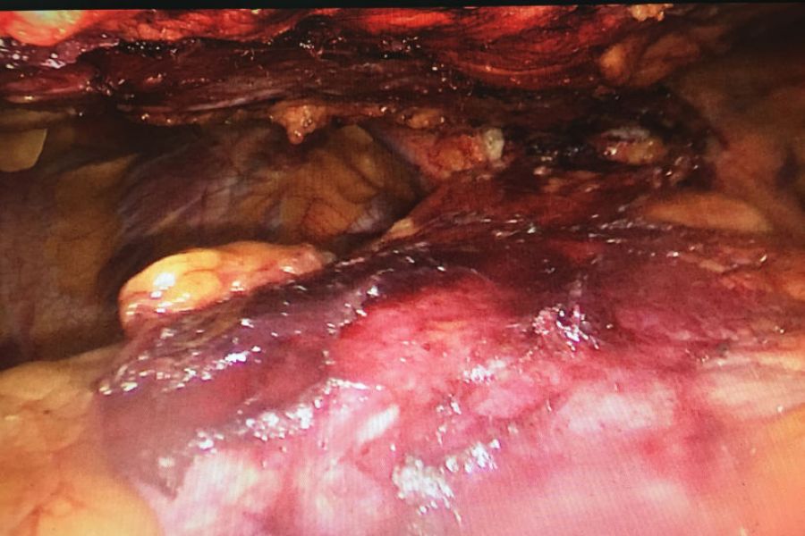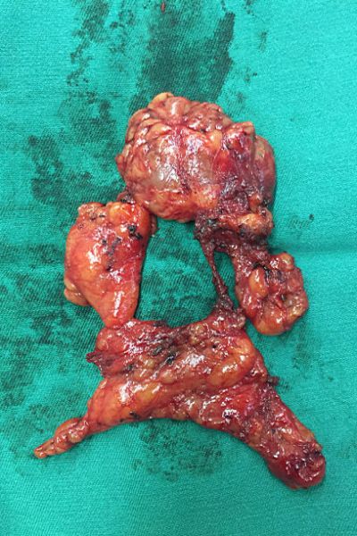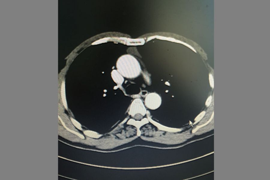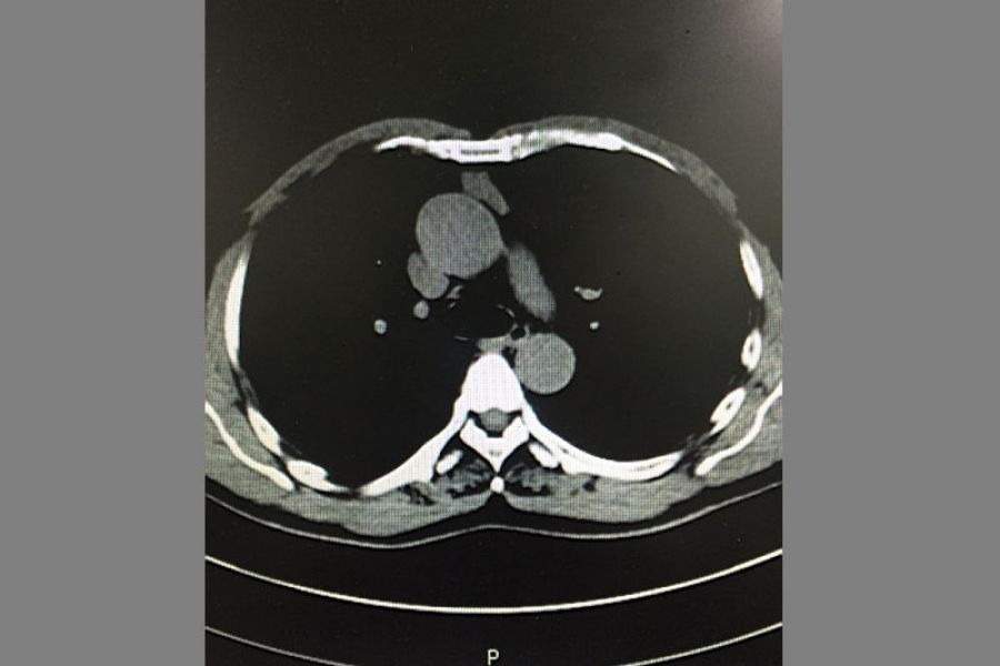 患者王某某40岁,因右胸阵发性疼痛1年入住我院疼痛科,检查发现前上纵膈肿瘤。经心胸外科钟强主治医师会诊后转入心胸外科。转入后予积极完善相关检查,排除相关禁忌症,考虑患者年轻,对创伤小、美观等要求,经研究决定予行胸腔手术。手术入路选择经剑突下切口,黄勇科主任及向加树副主任临场指导,术中杨智杰副主任医师、张建军主治医师及左选健住院医师密切配合,仔细解剖,历经2小时手术完整切除肿瘤。术后患者无明显并发症,主诉疼痛感轻,恢复良好。