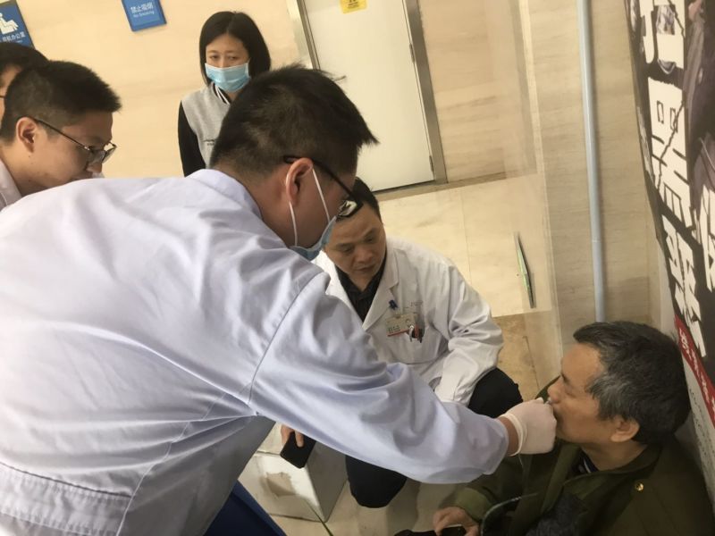 5月17日上午大约11点10分左右,院特勤队员罗勇在日常巡视中,发现一人瘫倒在内科大楼一楼大厅地上,罗勇感觉不对,马上通知保卫科工作人员张黎前来查看。张黎赶到后,立即上前询问,此时该病患满头大汗、脸色苍白、手捂胸口,已经说不出话来。张黎正准备拨打急诊科电话时,正好看见消化内一科主任李凯路过,张黎立即叫住了李凯主任。李主任发现情况危急,轻声问病人“你怎么了?”病人满头大汗艰难地拿出药瓶,李主任看了病人的药瓶,结合在医院看的病例过后大概知道病人的情况,马上给病人含服硝酸甘油。病人含服过后,李凯主任给病人擦汗,观察患者的情况,这时急诊科医生赶来了,李凯主任给急诊科医生交接过后,把病人抬上平推车,马上转往急诊科进行诊疗。