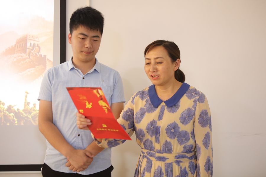 机关党支部书记杨金芝给谢安心宣读“政治生日”贺词