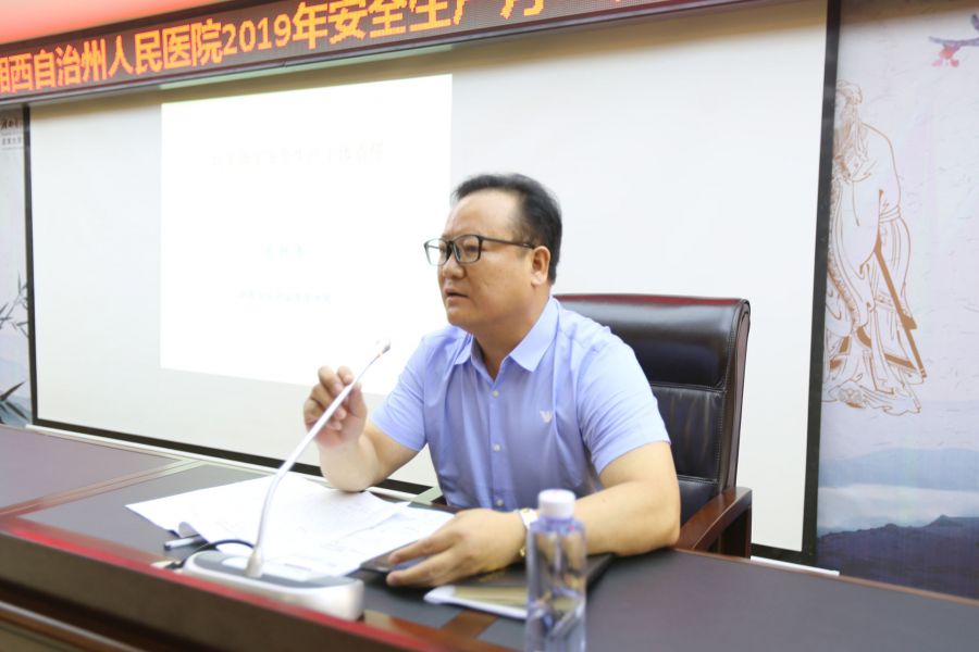 按照我院2019年安全生产月活动安排,6月20日上午9:00,在内科楼23楼二会议室举行了安全生产专题讲座,特邀州应急管理局副局长、州安委办副主任龙树意同志,湘西经开区消防大队副大队长张翔队长进行专题授课。讲座由贾小卷副院长主持,全体院领导及中层干部参加。龙树意副局长以“切实落实安全生产主体责任”为主题,对我院安全生产管理工作做了指导。张翔大队长播放了“2018年1月26日韩国庆南密阳医院火灾”警示片,并就医院消防安全知识对大家进行了详细的培训。