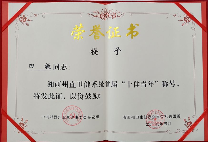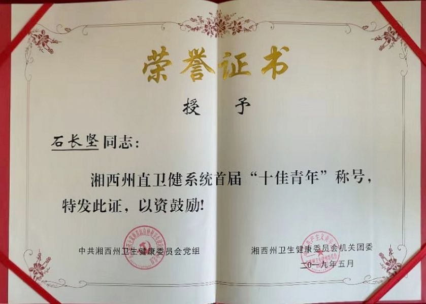 近日,中共湘西州卫健委党组、湘西州卫健委机关团委联合授予州人民医院两名青年职工石长坚、田敏州直卫健系统首届“十佳青年”称号。