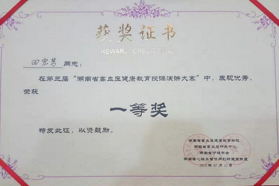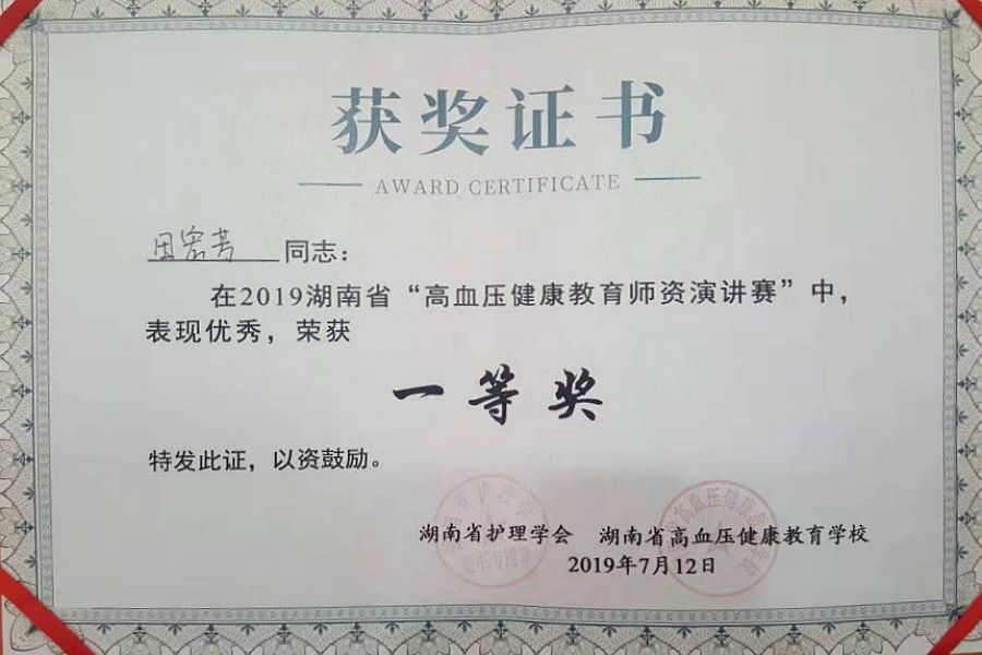 田宏芳荣获湖南省“高血压健康宣教”比赛一等奖