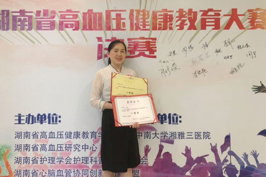 7月12日下午,由湖南省医学会心血管病专业委员会高血压学组、湖南省高血压健康教育学校、湖南省护理学会及湖南省高血压研究中心共同主办的“第三届湖南省高血压健康教育大赛”在湘雅附三医院成功举行。全省各县市级医院、社区医院及乡镇医院近80个单位积极响应,115名选手积极参加。经过层层选拔,最后有20名选手进入“高血压患者健康教育”演讲比赛决赛,每名选手演讲时间5分钟,我院心内三科田宏芳护士长在决赛演讲比赛中脱颖而出,荣获一等奖。