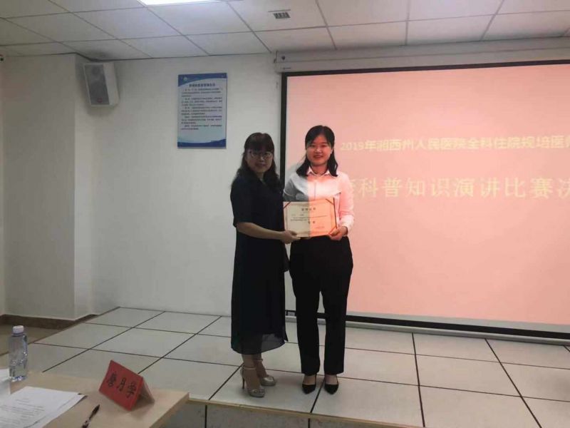 由副院长黄纯海领衔的专家评委团认真结合每位选手的语言表达、仪表风范、舞台感染力、时间掌握与整体效果进行综合打分,优中选优。最终2017级全科医师罗章艳和2016级全科医师明雪芹分别获得特等奖及一等奖,他们将代表州人民医院全科住院医师前往郴州市参加湖南省医学会全科医学专业委员会主办的健康知识科普比赛。
