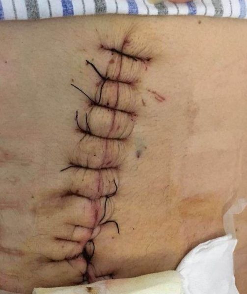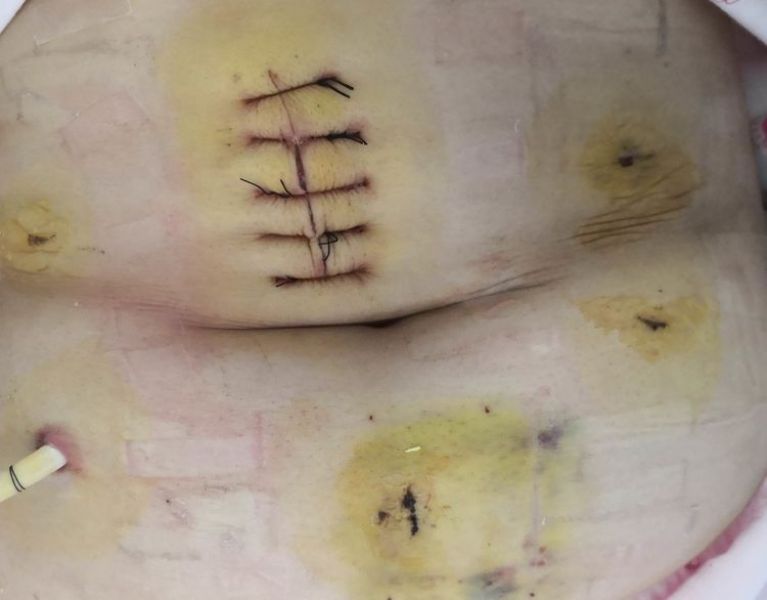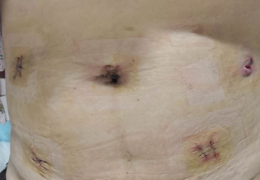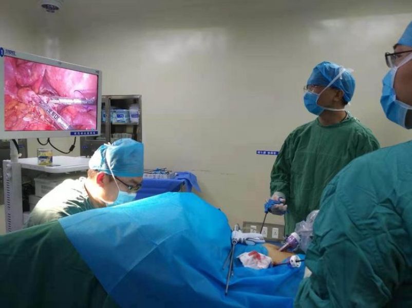 该名38岁的女性患者,因便血一月余入院,术前临床诊断为乙状结肠癌,经系统检查及术前评估患者符合腹腔镜下乙状结肠癌根治术手术指征。征得患者及家属同意后,由普一科杨闻晓科主任和李玉坤主任、张帆主治医师操刀,为患者实施了无体表切口NOSES结肠癌根治手术。手术仅用时120min,术中出血小于50ml。原本传统手术需要25cm的手术切口,仅通过腹壁的两个1cm、三个0.5cm戳口完成。腹壁没有可见手术疤痕。患者术后当天就开始恢复肠道蠕动,第2天就下床活动进食流质。