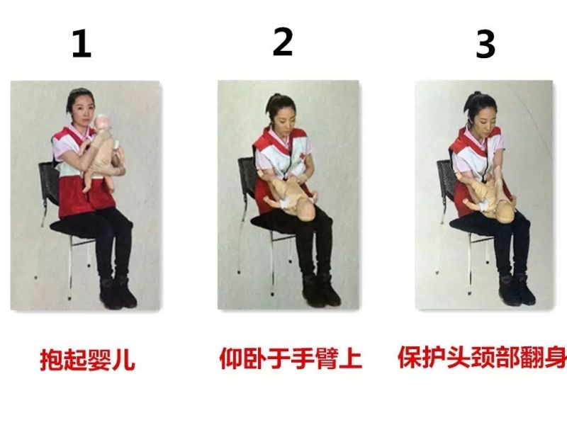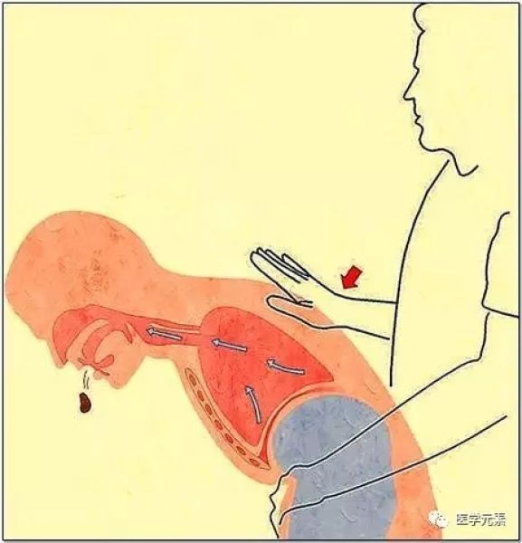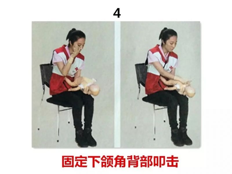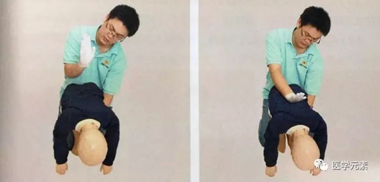 背部叩击法具体方法:将婴儿的身体置于一侧的前臂上,同时手掌将后头颈部固定,头部低于躯干,用另一只手固定婴儿下颌角,并使婴儿头部轻度后仰,打开气道。两前臂固定婴儿,翻转呈俯卧位,头低于身体。用另一只手的大拇指固定支撑婴儿的头,用另外1或2个手指放在下颌的另一边,用另一手的掌根部在肩胛骨之间给予5次快速的拍打。