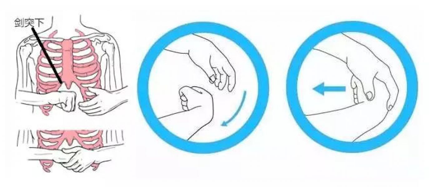 腹部冲击法(海姆立克急救法):适用于意识清醒,伴严重呼吸道梗阻症状,5次背部叩击不能解除气道梗阻的患儿。具体方法:双手至患儿后方环抱患儿,一手握空心拳,用拳头拇指指侧抵住腹部剑突下位置,另一只手紧握空心拳,用力快速将拳头向上、向内冲击5次。