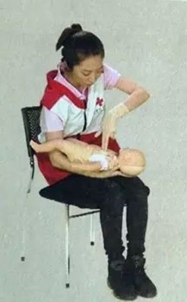 胸部冲击法:适用于意识清醒,伴严重气道梗阻症状,5次背部叩击法不能解除气道梗阻的婴儿。具体方法:两手及前臂将婴儿固定,翻转为仰卧的体位,头部向下;找到冲击按压部位,两乳头连线中点。给予胸部冲击按压,重复5次。