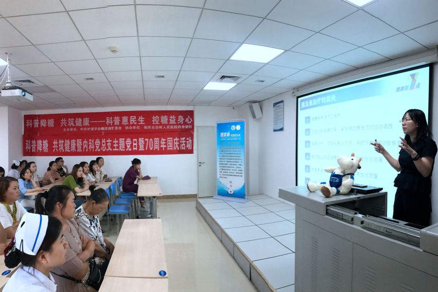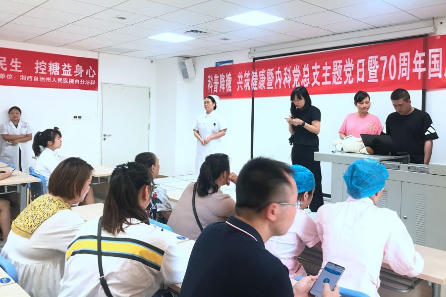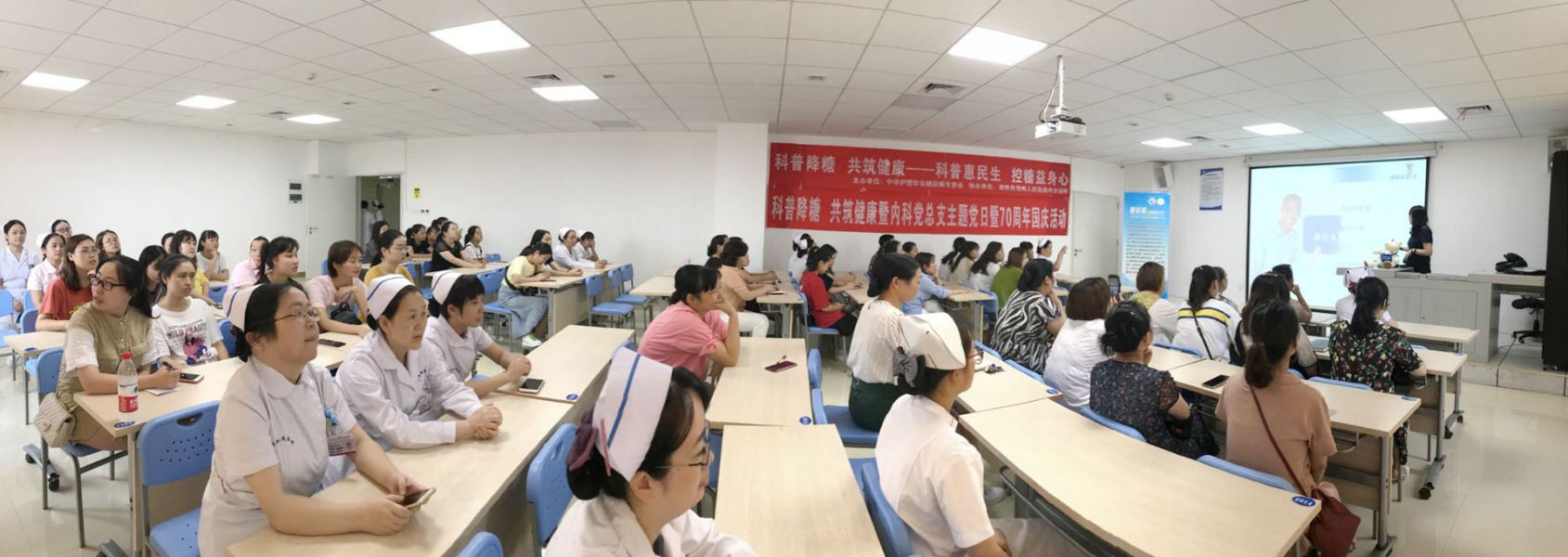为迎接祖国70华诞,深入推进“不忘初心,牢记使命”主题教育活动,响应国家《健康中国行动(2019-2030)》的号召,贯彻《中华护理学会关于举办2019年全国科普日活动》的精神,落实中华护理学会糖尿病护理专委会《糖尿病科普与教育工作规划》,内科党总支部于9月16日下午开展了主题为:科普控糖、共筑健康暨内科党总支主题党日暨70周年国庆系列活动——糖尿病科普讲座,百余名在院病人、家属、医护人员共同参与。现场过通俗易懂的方式讲解了糖尿病的基础知识、血糖的控制标准、胰岛素的作用、剂型、胰岛素笔(泵)的使用、注射部位的选择及轮换、针头更换、胰岛素的储存等。期间通过自由式提问方式,让大家参与其中,现场气氛活跃,课后耐心解答疑问,指出了患者操作中的误区,并给予纠正,同时还进行了糖尿病科普患者的基线调研,发放胰岛素注射定位卡。