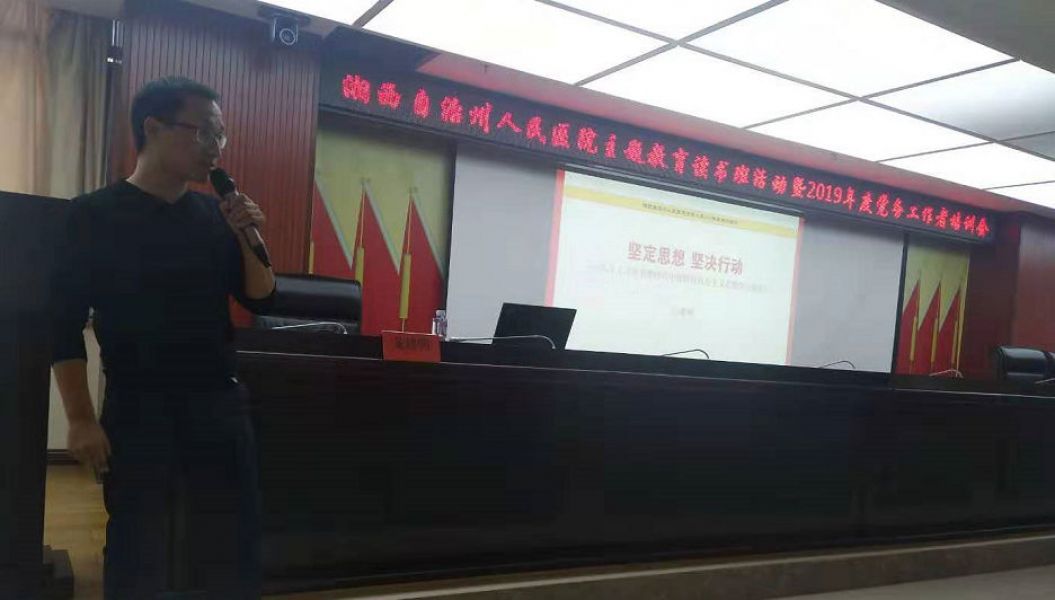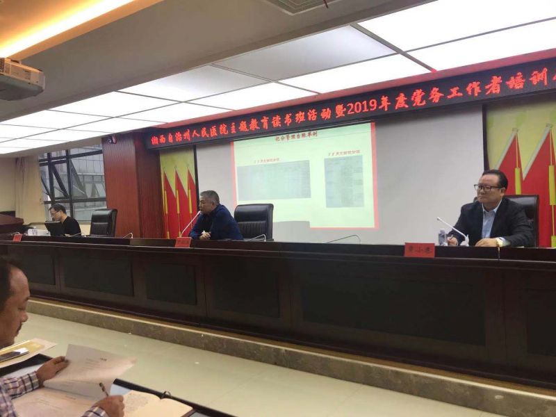 10月12日下午,州人民医院主题教育读书班活动暨2019年度党务工作者培训会在内科楼23楼二会议室如期举行,重点辅导学习《习近平中国特色社会主义思想学习纲要》。全院近200名党务干部、党员同志参加培训。会议由副院长贾小卷主持。院党委书记彭剑涛在会上讲话。
